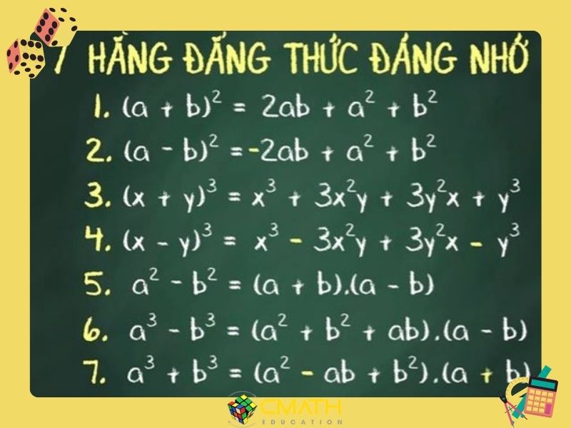 7 hằng đẳng thức đáng nhớ là các công thức đại số thể hiện mối quan hệ giữa bình phương, lập phương của tổng – hiệu và các tích đặc biệt.