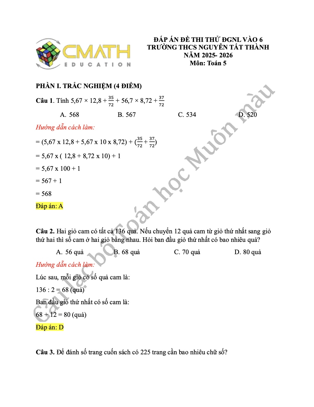 ĐÁP ÁN ĐỀ THI THỬ ĐGNL VÀO 6 TRƯỜNG THCS NGUYỄN TẤT THÀNH NĂM 2025