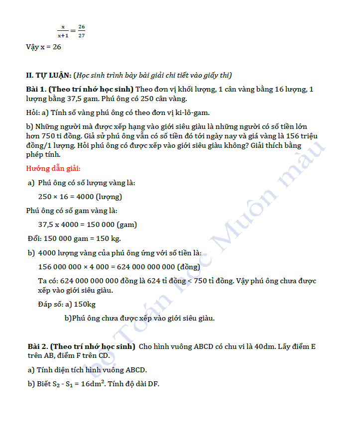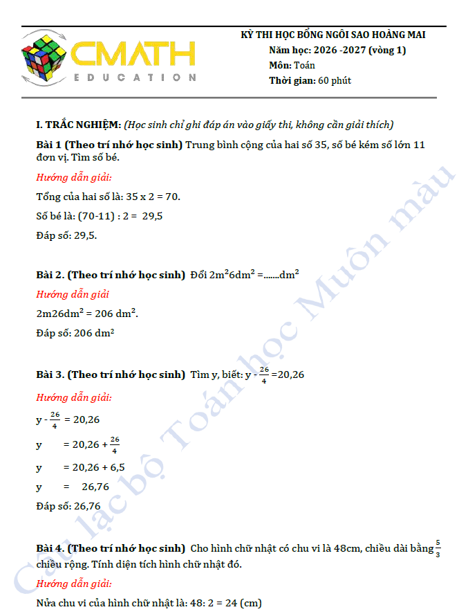 ĐÁP ÁN KÌ THI HỌC BỔNG NGÔI SAO HÀ NỘI – Môn Toán Lớp 5