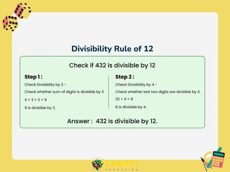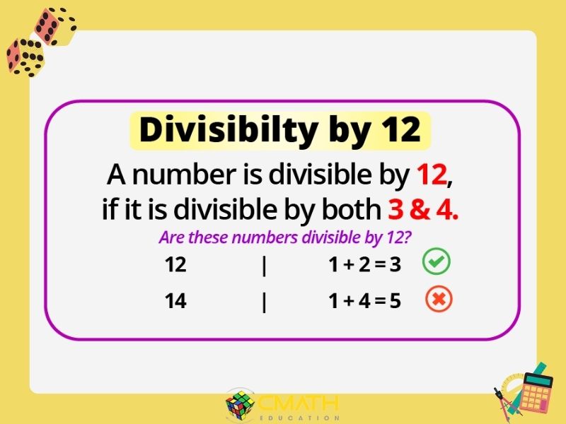 Ví dụ: Số 15648 có tổng ba chữ số cuối là 6 + 4 + 8 = 18 chia hết cho 12, nên số 15648 chia hết cho 12.