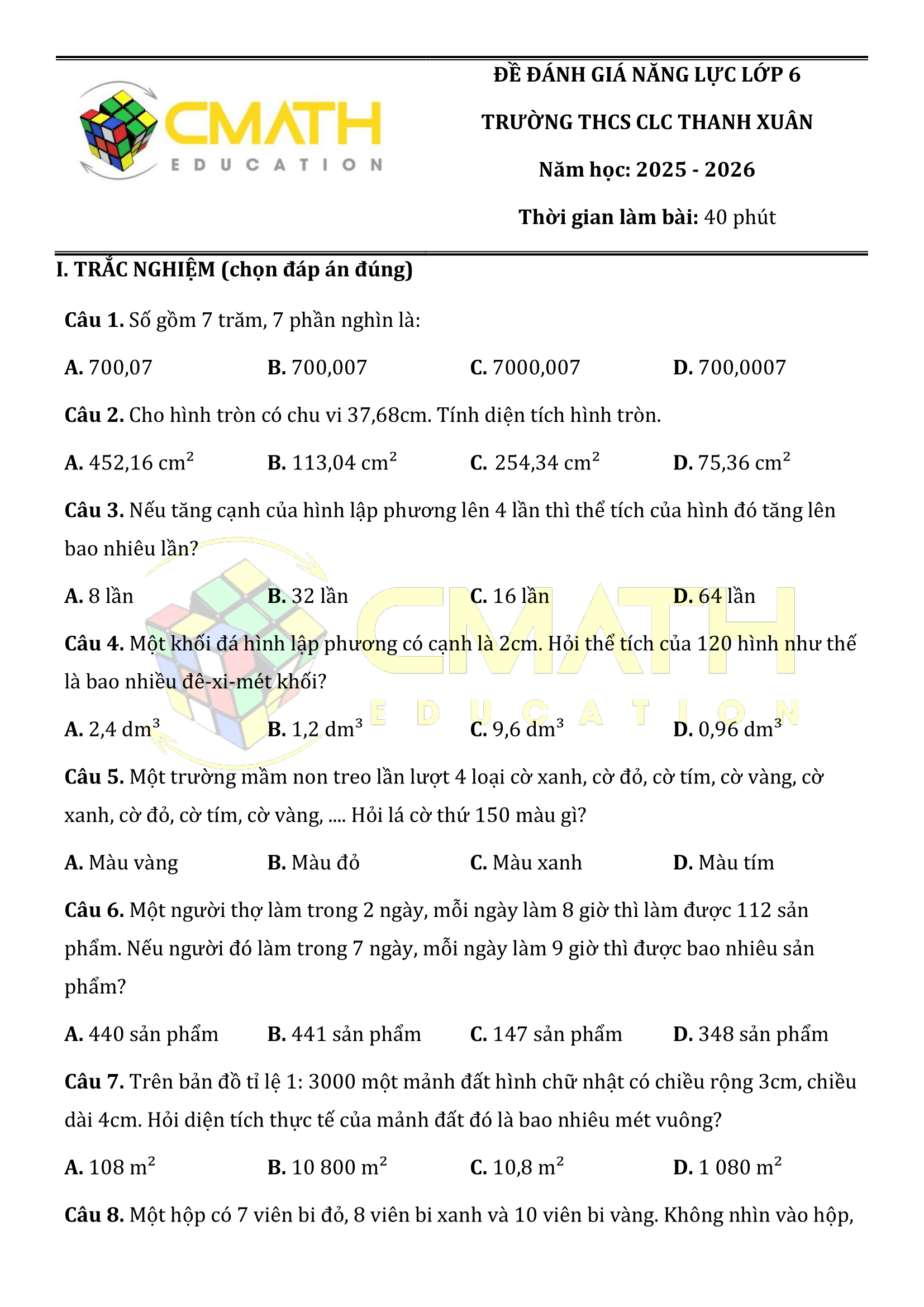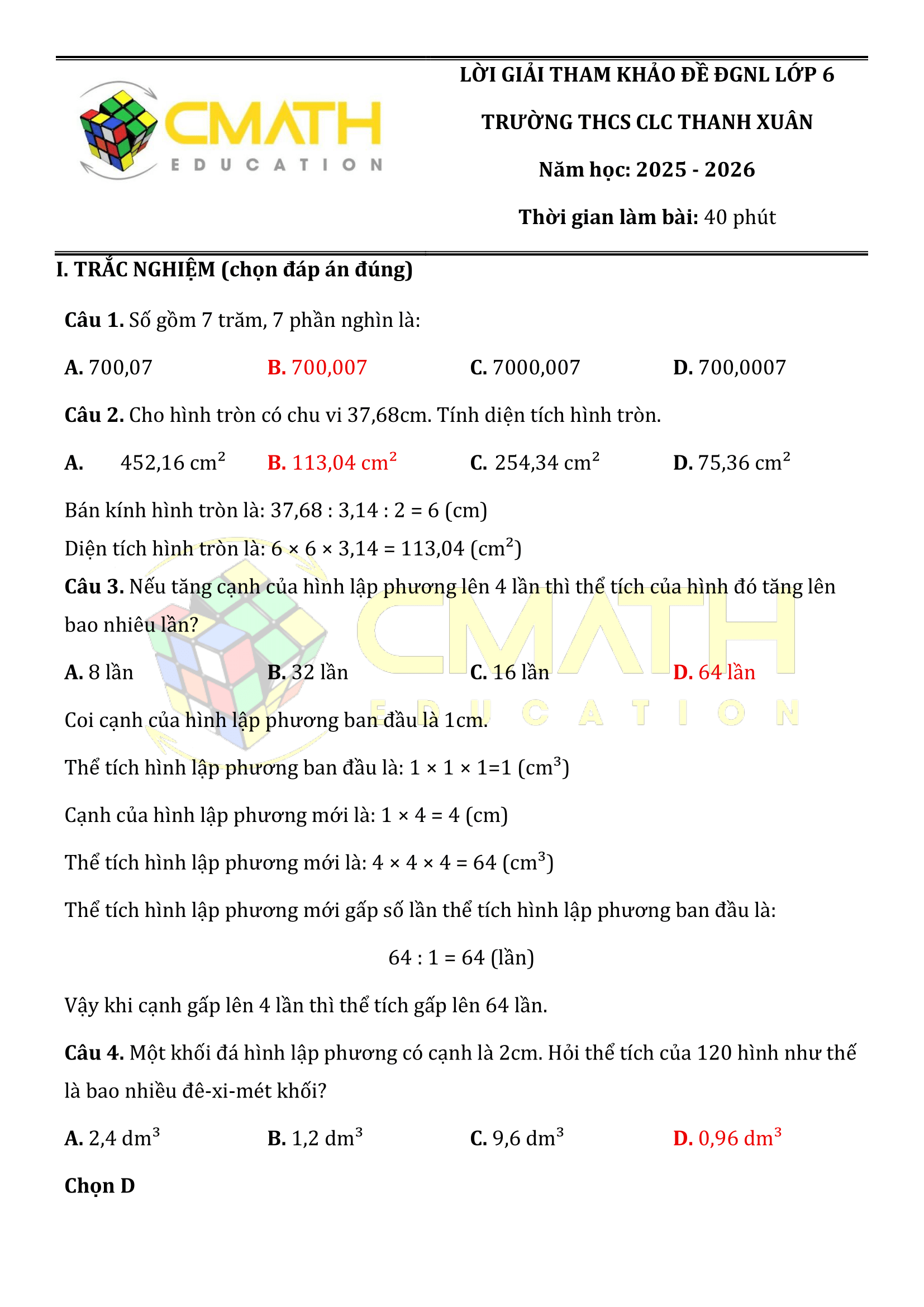 ĐỀ VÀ LỜI GIẢI KỲ THI ĐGNL LỚP 6 TRƯỜNG THCS CLC THANH XUÂN NĂM HỌC 2025-2026